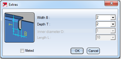 Use the Z-fold, 2 points function to attach two contiguous sheets with relief groove creation. When you call the function, the input mask for the relief groove will be displayed first: