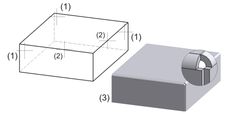 Use the New sheet from surface function to construct, via specification of a sheet thickness, new sheet metal parts from the surfaces of a 3-D body. Specify whether you want to apply the thickness to the inside, the outside or centrally. Double-clicking the corresponding Feature log entries enables you to modify the sheet subsequently. You can select an edge or a cylindrical surface as bend zone.