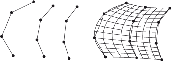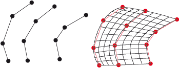 The parameter lines of the created freeform surface are cubic splines, i.e. they can be continuously differentiated twice, they are smooth, without tangential constraints and interpolating. |