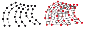 The parameter lines of the freeform surface are Akima splines. These are, in contrast to cubic splines, local. Polynomes of the third degree are uses here, too, which can however only be continuously differentiated once within the entire domain of definition. This means that the new composite edge is only determined by the control points in the immediate neighbourhood. As the Akima spline can divided straight lines and planes exactly, it has a less wavy run than the cubic spline. |