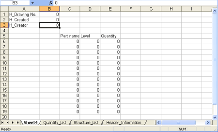 Now add further document data to the template, so that the additional header information Drawing No., Created and Creator will be output when executing the Excel export. Proceed as follows: