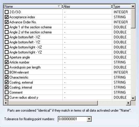 Parts are regarded as identical if all files activated under "Name" coincide. Click the check box preceding the part name to select/deselect it.