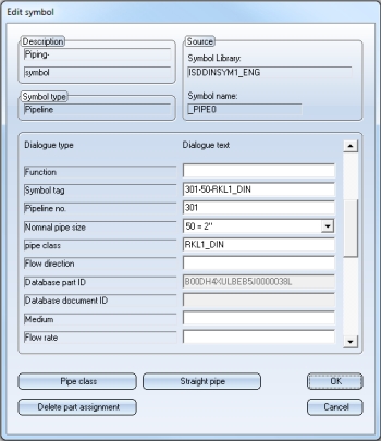If a pipe class has been assigned to a pipeline symbol, the corresponding Edit symbol dialogue will look as follows: