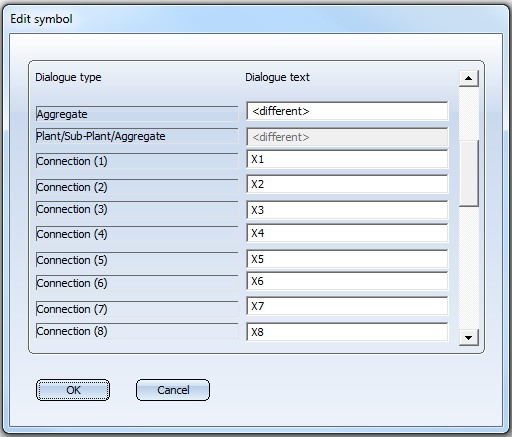 The data of the symbols will be collected in the Edit symbol dialogue window. The <different> entries in the Dialogue text window indicates that the values for this dialogue type are different for the selected symbols.