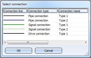 For both functions, a list of defined connection types will be displayed. Select the desired connection type with a double-click. Use the cross-hairs to specify the points. After creating a connection line, you can directly create another one with the same connection type without having to open the selection list once again.