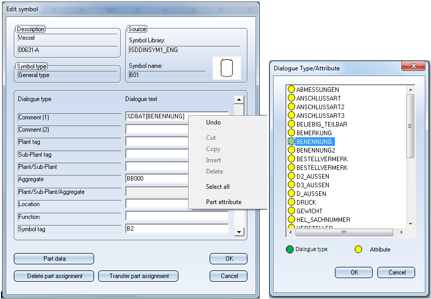 If, in the database mask of a P+ID symbol, dialogue texts of the type "Comment" or of user-defined dialogue types contain a link to a database attribute (i.e. of an assigned part or a part to be assigned), the corresponding attribute contents (values) are taken over into the dialogue texts.
