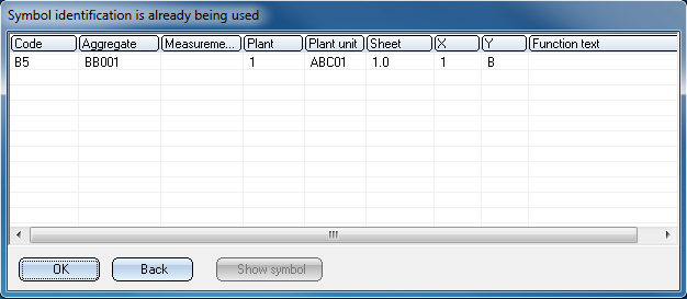 If a non-unique identification is entered, the symbols that already have this identification will be listed in a dialogue box.
