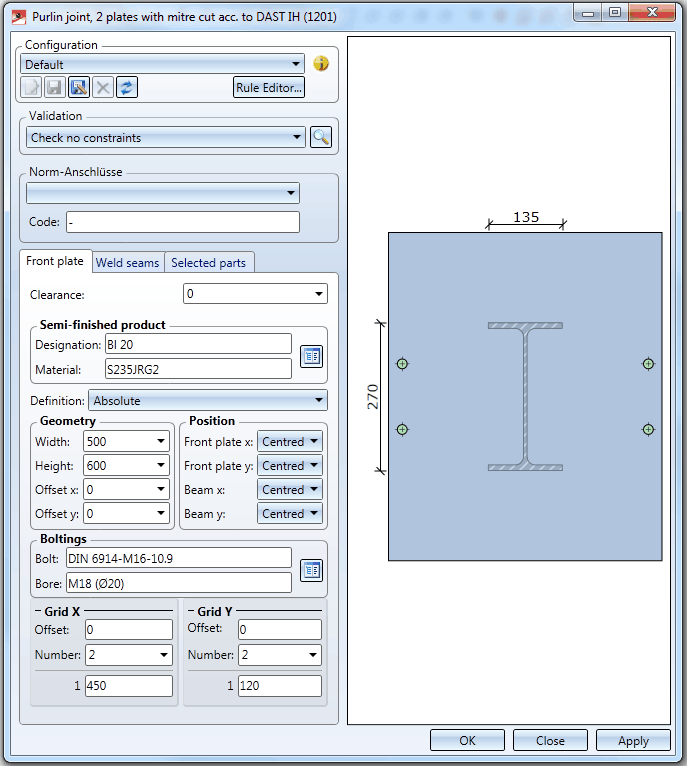 The fields of the dialogue window, e.g. the data for the plate or the bolting, will automatically be filled with the values from the DAST table. If you change these values, HiCAD will always check whether the connection will still be DAST compatible after the changes.