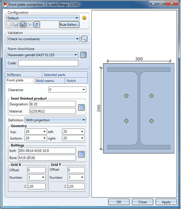 You can create the connection with or without stiffeners. The settings can be made separately for the upper and the lower stiffener.