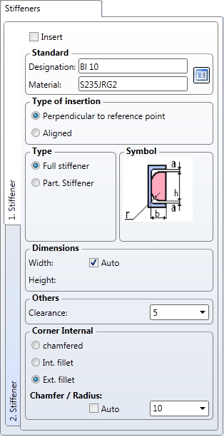 If you want to fit the stiffener, activate the Insert checkbox and click the icon to select the stiffener type from the catalogue.