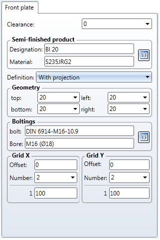 In this tab you specify type and size of the plate, the position of the plate in relation to the beam, the bore type and the and the bore grid.
