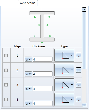 Activate the corresponding checkboxes to select the edges on which you want to place the weld seams. You can select a weld seam type for each edge and specify the thickness of the seam. Furthermore, you can define weld seam annotations for all edges to be welded together. Click the , symbol to open the Weld seam dialogue. It is operated largely in the same way as the dialogue of the 3-D function Insert weld seam symbol.