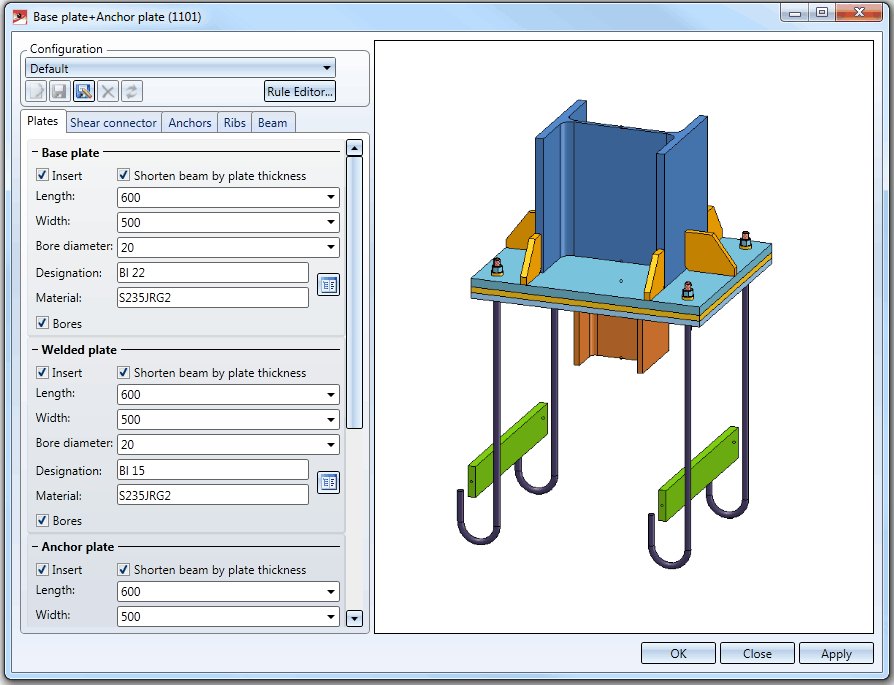 The configuration of the base plate/anchor plate takes place via the following tabs of the dialogue window: