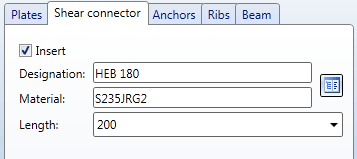Here you determine the profile for the shear connector, its length and its material. Click the icon to select the beam and material directly from the corresponding standard part catalogues.