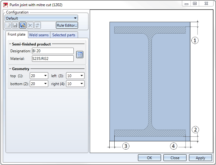 After entering all required data, you can fit the purlin joint. If you select Apply, the purlin joint will be fitted, but the dialogue window will remain open. If you select OK, the purlin joint will be fitted, and the dialogue window ill be closed. If you select Close, the changes will be discarded and the window will be closed without fitting the purlin joint.