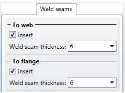 On this tab you specify whether you also want to create weld seams on the web and/or flange. If you want to create weld seams, activate the corresponding checkbox and enter the seam thickness