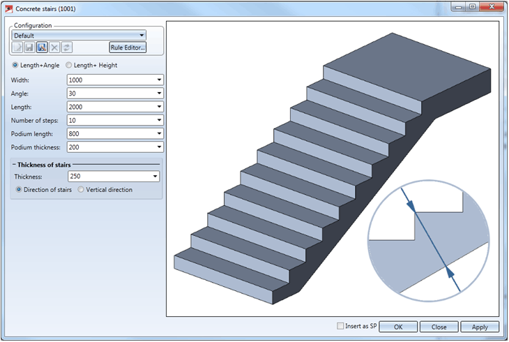 In the lower area of the dialogue window you specify the thickness of the stairs. The thickness can either be applied in the direction of the stairs, or in vertical direction.