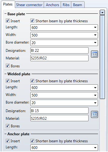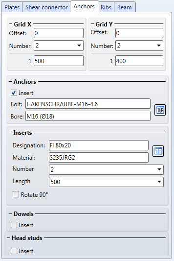 On this tab you determine whether you want the base plate/anchor plate to be inserted with anchors, head studs or dowels. Activate the corresponding Insert checkbox. The corresponding input fields will then be activated.