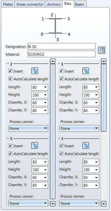 Use this tab to insert ribs, i.e. additional stiffeners on flange and web.
