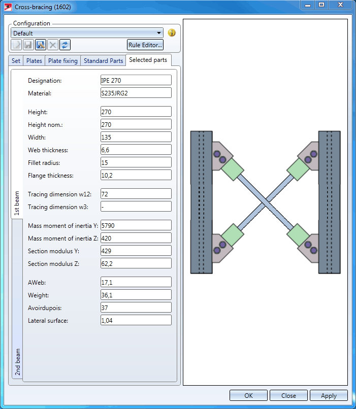 After entering all required data, you can fit the cross-bracing. If you select Apply, the cross-bracing will be fitted, but the dialogue window will remain open. If you select OK, the cross-bracing will be fitted, and the dialogue window ill be closed. If you select Close, the changes will be discarded and the window will be closed without fitting the cross-bracing.