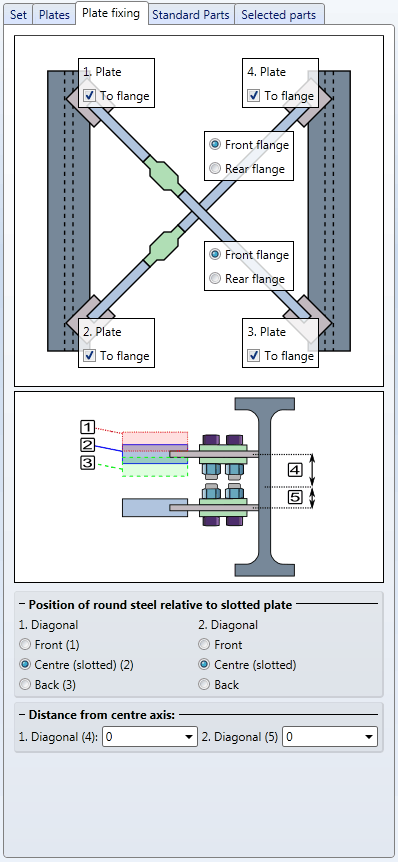 On this tab you specify whether you want to use steel plates for the mounting of the bracing members to the beams and, if so, what types of plates, and in which way you want to mount them to the beams.
