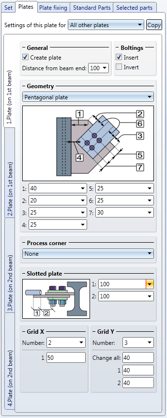 The bore grid determines the arrangement of the boltings that connect the gusset plate and the slotted plate. Enter the number of bores in X- and Y-direction , and their distance to each other. If you want all bores running in one direction to have the same distance to each other, you can simplify the data entry by doing the following: Enter the distance value into Change all field. All fields will automatically be assigned the entered value.