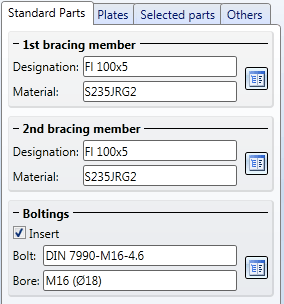 In this area you specify the beams onto which the cross-bracing is to be mounted. Permissible types for the bracing are U- and L-beams and flat steels. Click the icon to select the bracing member as well as the material directly from the corresponding Standard Part catalogues.