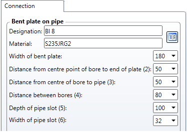 On this tab you specify the settings of the bent plate for the pipe. Click the icon to select the plate type and the material directly from the corresponding Standard Part catalogue.