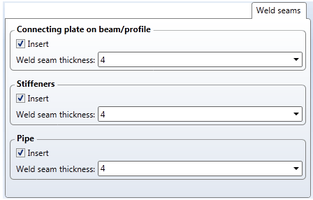 On this tab you specify whether you also want to create weld seams for the connecting plate on the beam (1), for the stiffeners (2), and for the pipe (3). If you want to create weld seams, activate the corresponding checkbox and enter the seam thickness.