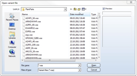 A variant file (VAA, VAD) can be selected via the Windows file system. For example, you can select the via file system option from the File selection list box and click Open or Derive new. The standard dialogue for variant file selection will be displayed.