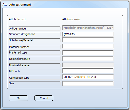The article number can be configured via the button This button enables the configuration of the attribute value for the Article number attribute. (when performing a part data synchronisation with the HELiOS Database, the content of this attribute will be assigned to the HELiOS part attribute BESTELLVERMERK (=ORDER_NOTE). Click Select attribute (or press CTRL+A). A list of part attributes (except for the Article number) preset for the current part will be displayed.