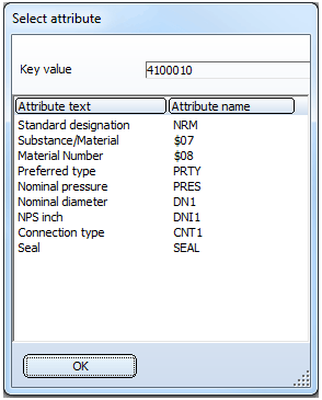 If you double-click a row or mark the row with a left-click and select OK, the corresponding attribute name will be inserted in <> bracktes at the current cursor position in the input field of the Article number configuration dialogue. The name is the placeholder for the actual attribute value. If you click Save (or press CTRL+S), the content of the input field will be saved as an article number configuration to a file, provided that this sequence of characters does not exist yet.For each part type, a corresponding file exists in the subdirectory PlantParts\CatSearch, e.g. 1010011.DesignationConfig.txt. You can select yet another of the article number configurations that are saved for the current article number configurations. Click Load (or press CTRL+L) ,then double-click a row or mark the row with a left-click and select OK. The corresponding configuration is then entered in the input field. When you then click Apply, you will be asked whether you want to save the article number configuration entered in the input field, if it has not been saved yet. If you now click the button |