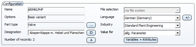 Here you can switch between the two branches of industry, Standard Plant Engineering and Air ducts. The third, option is meant for non-Plant Engineering variants and do not contain any part type- and industry-relevant information. For these variants (currently planned) the buttons for part type, article number and constant attributes will be inactive, as these data will be industry-dependent.