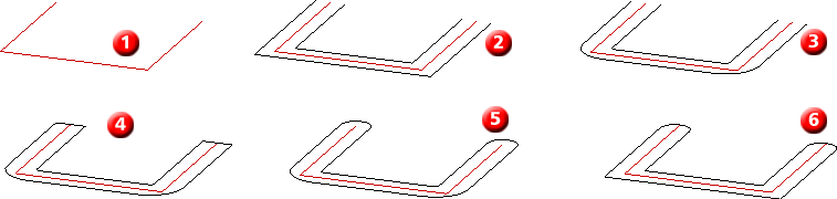 (1) Original sketch, (2) Offset without filleted corners and end caps, (3) Offset with filleted corners without end caps, (4) Offset with filleted corners and end caps: Lines, (5) Offset with filleted corners and end caps: Offset - Arc (6) Offset with filleted corners: Arc