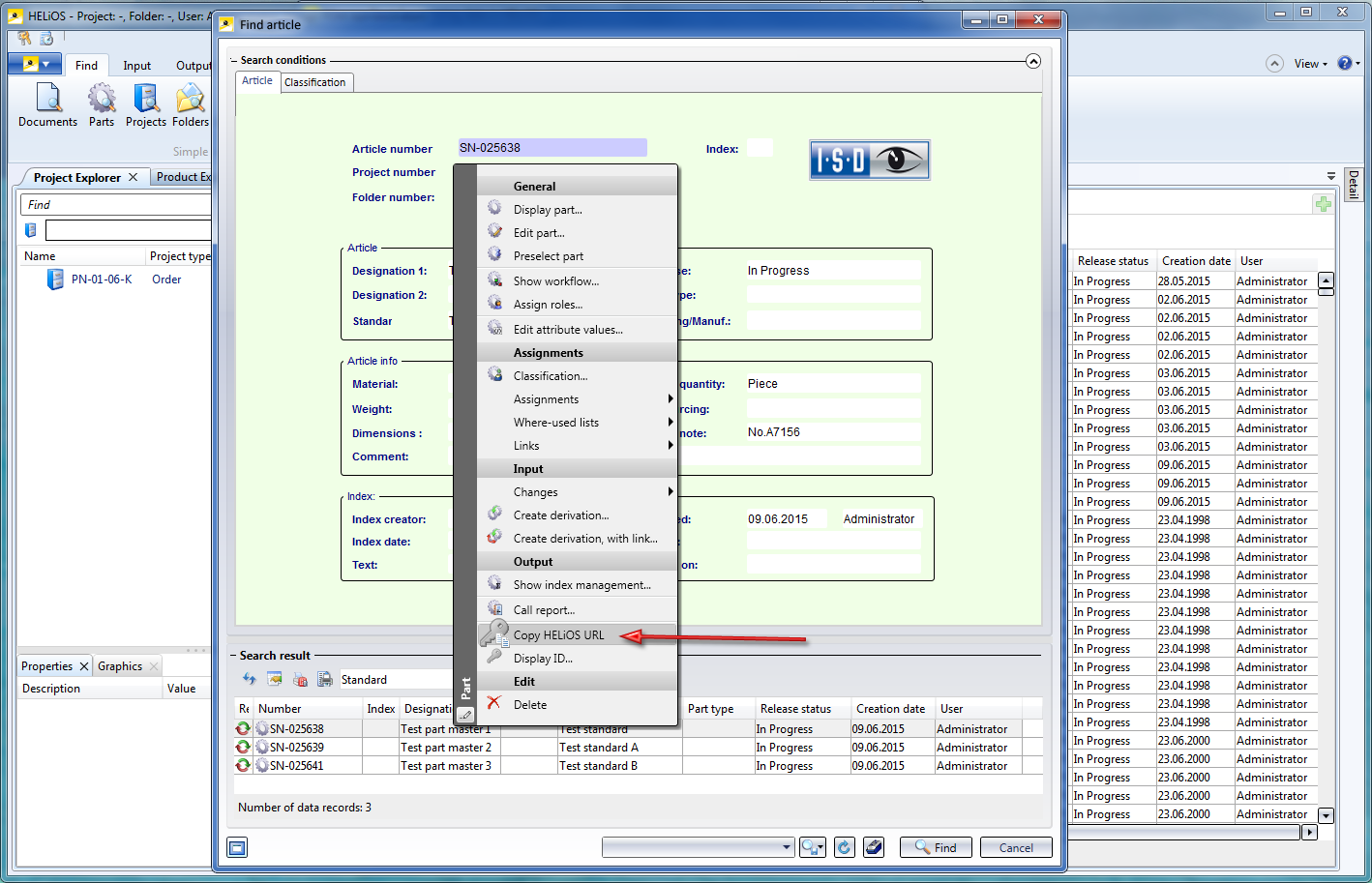 However, if you do not want a new article master for this sub-type, but want to use an already existing one instead, right-click the desired article master in the HELiOS Desktop window and select Copy HELiOS URL.