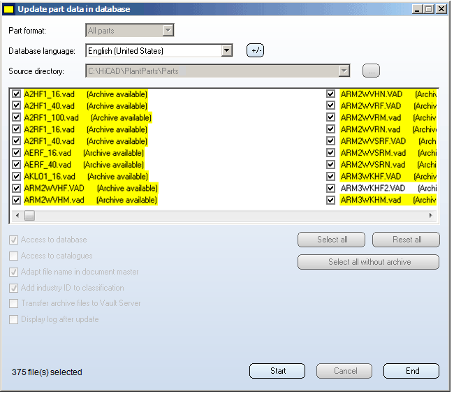 The update of the part data begins. Depending on the number of existing part files, this process can from a few minutes to up to half an hour; this time can be significantly longer if the data are transferred via a network. The updating was successful if an archive file could be generated for all parts with article master data (or catalogue entry, respectively, in case of the Catalogue as part data source). For all other parts, too, an archive file will be created if possible. If the updating was not successful, an error log will be displayed, indicating for each part whether or not an archive file could be successfully generated.