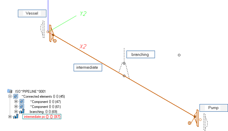 When indicated elements are used, another level called ~ConnectedElements will be added to the 3-D part structure of the pipeline isometry. Beneath this item you will find a sub-item called ~Component for each indicated component, and a sub-item with the name of the indicated pipeline.