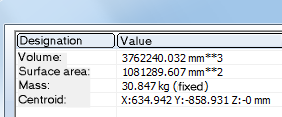 Detects the surface area, the volume and the mass of the active part. Please note that the mass depends on the material assigned to the part.