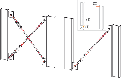 This function enables you to connect beams by means of a cross-bracing or a diagonal cross-beam made of round steel. You define the options and parameters for the bracing in the Bracing set dialogue window.