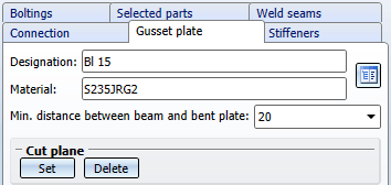 Enter the minimum distance between beam and bent plate. In some cases it can be useful to specify a cut plane for the plate: Click Set and specify the surface in your drawing that you want to use as cut plane for the gusset plate. Then, you can specify the processing of the plate corner via the Process corner selection list: Possible options are: None, Chamfer, Inner fillet.