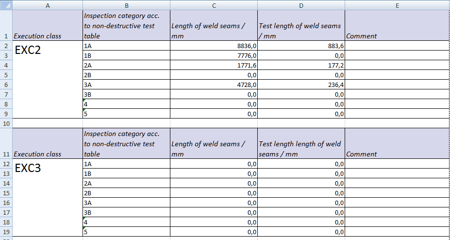 to display the scope of a weld seam inspection in the form of a weld seam test protocol. The test protocol contains, for each execution class and inspection category acc. to DIN EN 1090, the total length of the weld seams.
