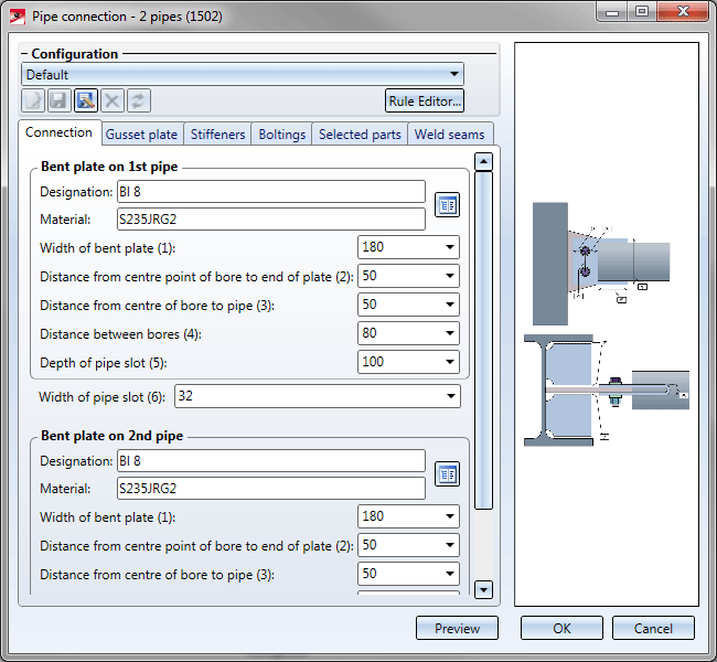 Click the Preview button if you want to display a preview of the connection based on the currently entered data. If you want to modify the current data, apply the required changes and click Preview again to update the preview. Click OK to insert the connection according to the current data and close the dialogue window. If you click the Cancel button, the window will be closed, and the specified or changed connection will not be inserted.