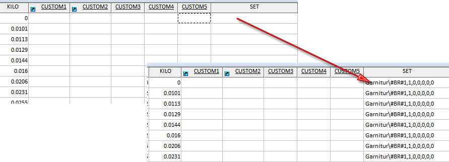 (2) SET column with string Garnitur\#BR#1,0,0,0,0,0,0, i.e. only the bolt is BOM-relevant
