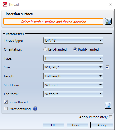 If this checkbox is active, the thread will be inserted immediately after the parameters have been determined. If the checkbox is inactive, a preview of the thread is displayed and the parameters can still be changed. Only after a click on the Apply button (or on OK or by pressing the middle mouse button) will the thread be inserted.