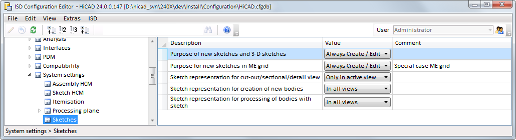 Sketches with the purpose Create/Edit are in principle "auxiliary elements" from which other parts or processings, or sectional views, detail views or cut-outs can be derived. Sketches with this purpose are represented in the active by broader lines, and they are also visible in the shaded model.