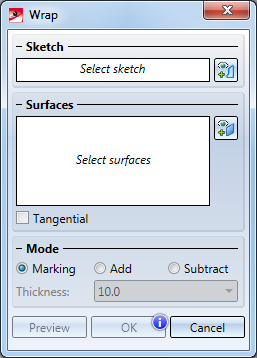 icon and identify the sketch for the wrapping in the drawing. The sketch must run parallel to a tangential plane of one of the selected surfaces.