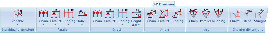 The dimensioning functions can be found on the 3-D Dimensioning + Text tab: