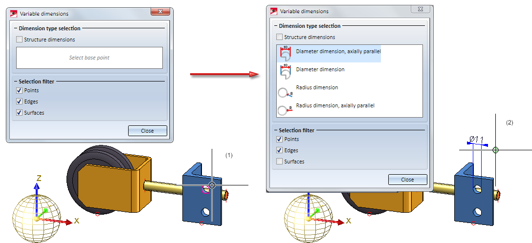 with only one function. Depending on the selected element, e.g. edge, full circle or point, it directly creates the "correct" dimension or, if several dimensions are possible, allows you to choose the desired dimension.