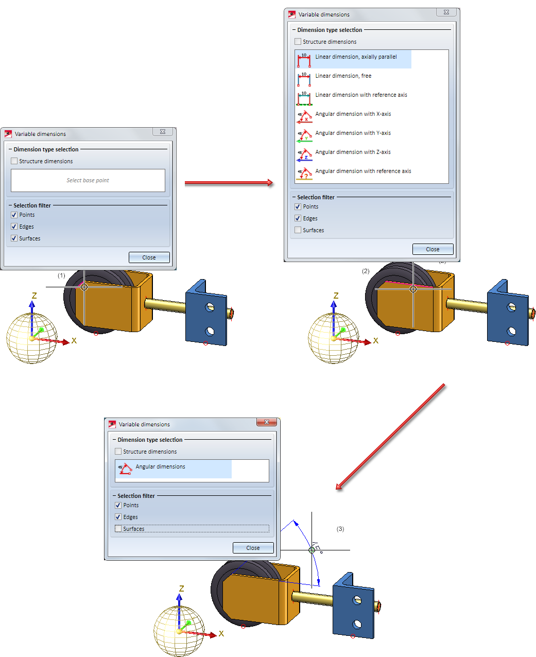 - angular dimensions between an edge and the X-, Y- or Z-axis,
