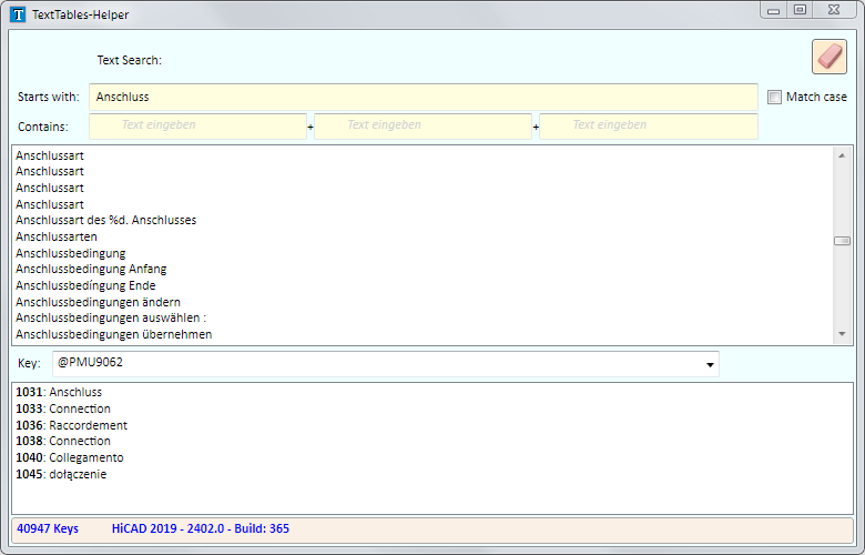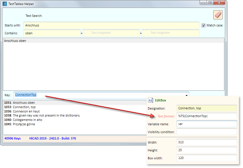 If you want to use on of the found texts, choose it from the result list, mark the associated key and copy it. This key can then be used in the Text format field of the HiCAD GUI Editor, in the form %TSkey), e.g.: